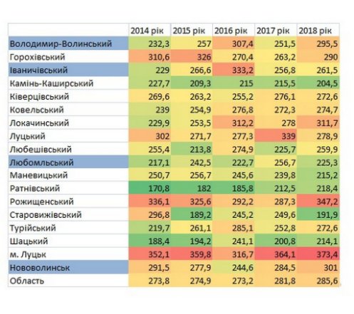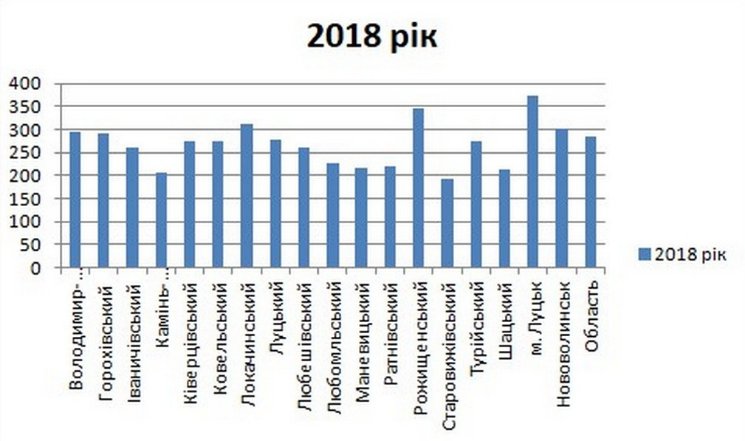 Серед населених пунктів області перше місце в 2018 році займав Луцьк, друге – Рожищенський район, третє – Локачинський, четверте – місто Нововолинськ.