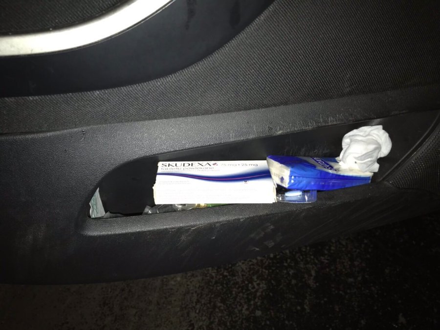 У ніші дверей легкового автомобіля, який в'їжджав в Україну з Республіки Польща «зеленим коридором» пункту пропуску «Устилуг», виявили блістер (10 шт) таблеток "Skudexa" в упаковці виробника.