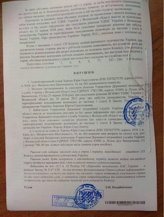 Суд зобовʼязав посадових осіб Управління ДМС у Волинській області внести у відповідні реєстри інформацію про скасування рішення про позбавлення громадянства Харона та відшкодувати йому грошові витрати на судовий збір.