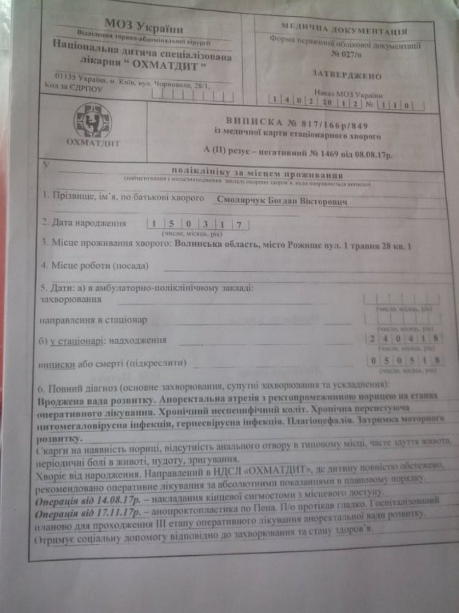 Лікарі поставили невтішний діагноз: вроджена вада розвитку. Аноректальна атрезія з ректопромежинною норицею. Хронічний неспецифічний коліт. Сім'я Смолярчуків уклінно просить всіх, хто має змогу, допомогти їхньому синочкові поборотися за здорове життя.