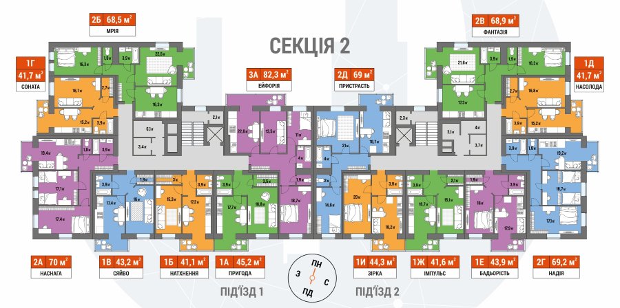 Планування дозволить втілити найсміливіші ідеї дизайну інтер’єру. Це: панорамні вікна, просторі кухні, зручні кімнати, великі вікна з гарним виглядом, гардеробні, лоджії з балконом.