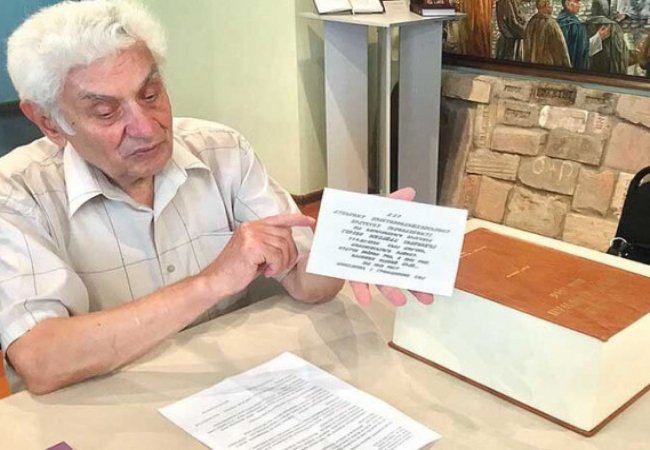 Книгу передав член Луцького Хрестовоздвиженського братства (відродженого) Михайло Герець зі США. Цей унікальний фоліант він надіслав почесному голові братства Андрієві Бондарчуку, який і представив цю книгу.