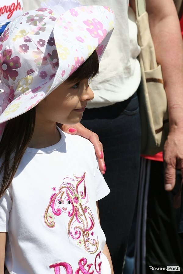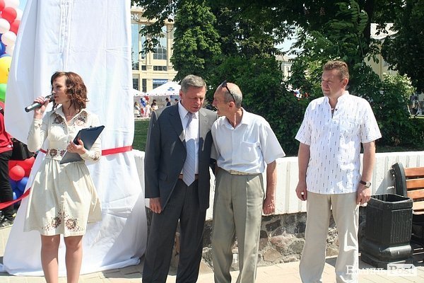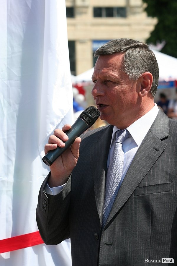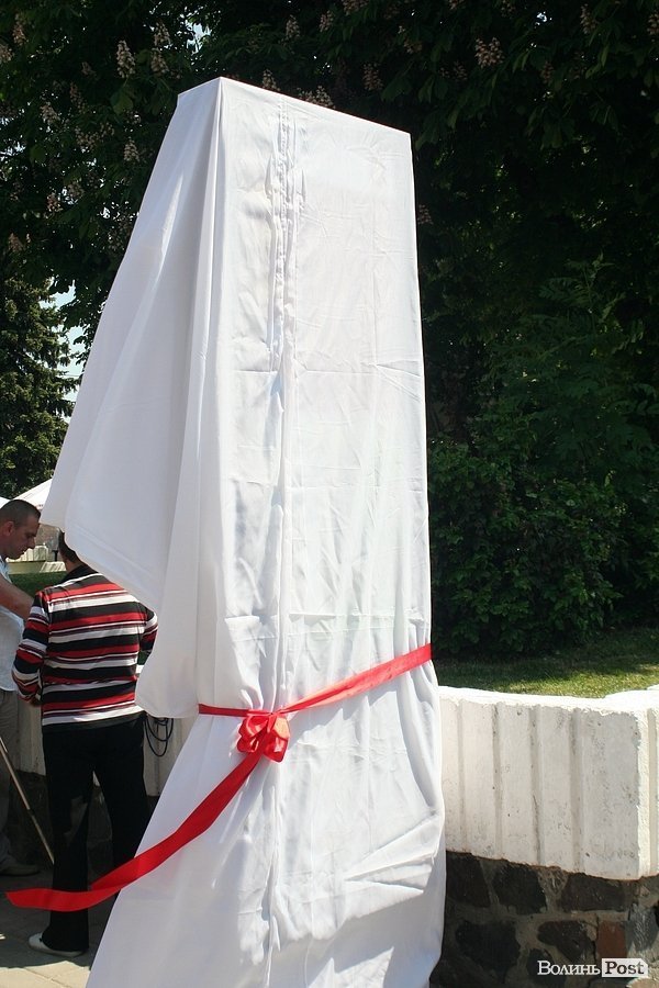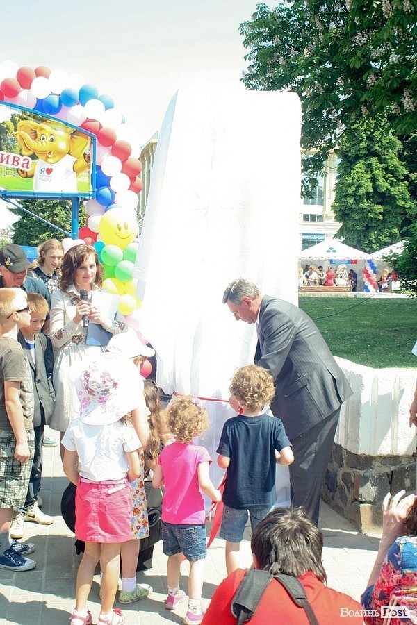 Разом із маленькими дітьми Луцький міський голова Микола Романюк розв’язав червоний бант і зняв білу накидку з інформаційного пілону.