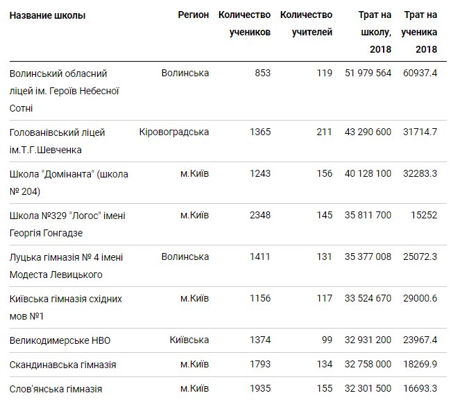 Так, у топ-5 шкіл за найбільшим держфінансуванням увійшли Волинський обласний ліцей ім. Героїв Небесної Сотні, Голованівський ліцей ім. Тараса Шевченка (Кіровоградська область), школи "Домінанта" і №329 "Логос" ім. Георгія Гонгадзе міста Києва, а також гімназія №4 ім. Модеста Левицького міста Луцька.