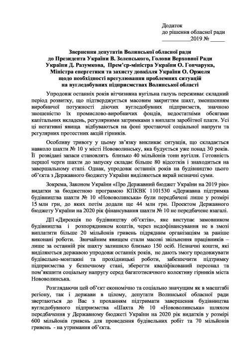 «…депутати Волинської обласної ради звертаються до Вас з проханням підтримати завершення будівництва вугледобувного підприємства «Шахта № 10 «Нововолинська» шляхом передбачення у Державному бюджеті України на 2020 рік видатків у розмірі 600 мільйонів гривень для проведення будівельних робіт та 70 мільйонів гривень – на утримання об’єкта», – йдеться у зверненні.
