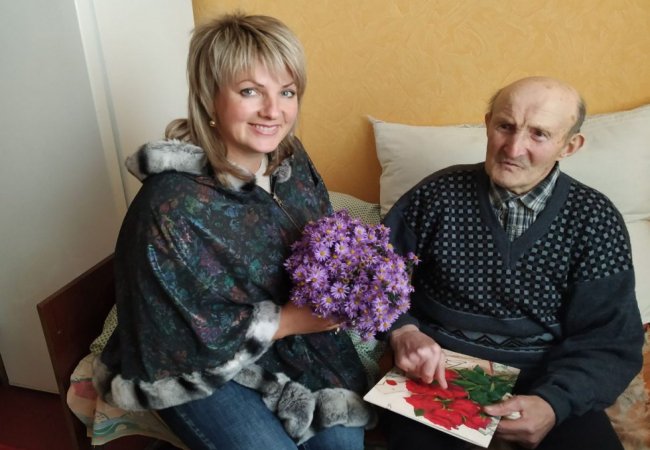 В. о. старости Оксана Кравчук і спеціаліст Служби у справах дітей, сім’ї та соціального захисту населення Марія Пазюк привітали довгожителя.