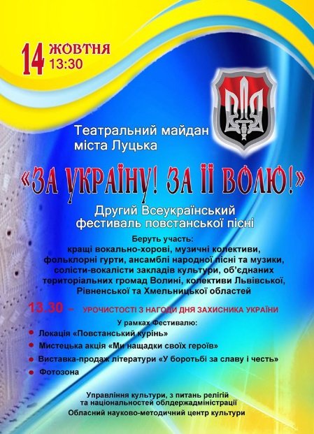 У Луцьку 14 жовтня відбудеться Всеукраїнський фестиваль повстанської пісні «За Україну! За її волю!»