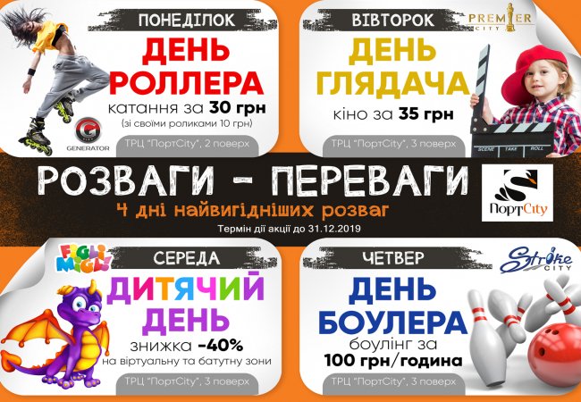 Понеділок – "День роллера" на Арені розваг GeneratorCity, 2-й поверх. Катання на роликах в цей день вартує 30 гривень, а зі своїми роликами лише – 10 гривень.