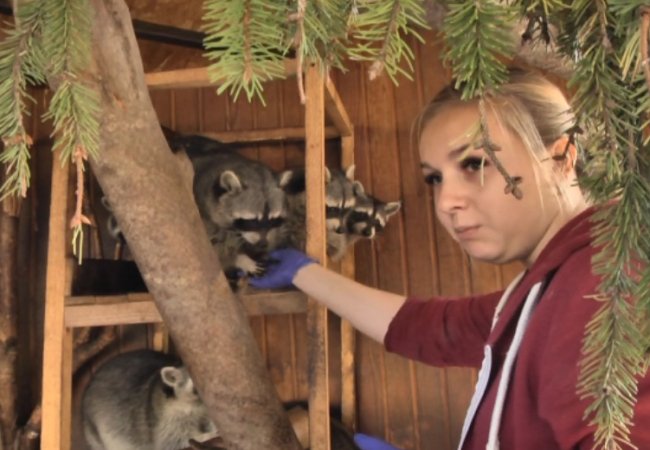 Годувальниця тварин Іванна Репецька роздає їжу. Для єнотів, крім основного раціону - яєць, хліба і м’яса, - має арахіс у шоколаді. Ці солодощі – рідкість.