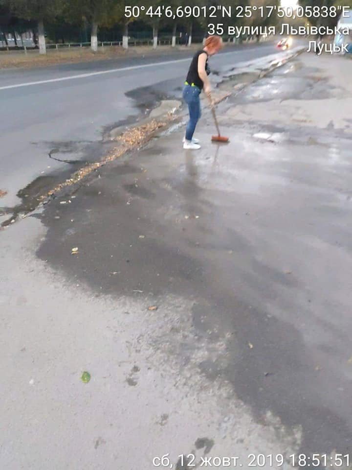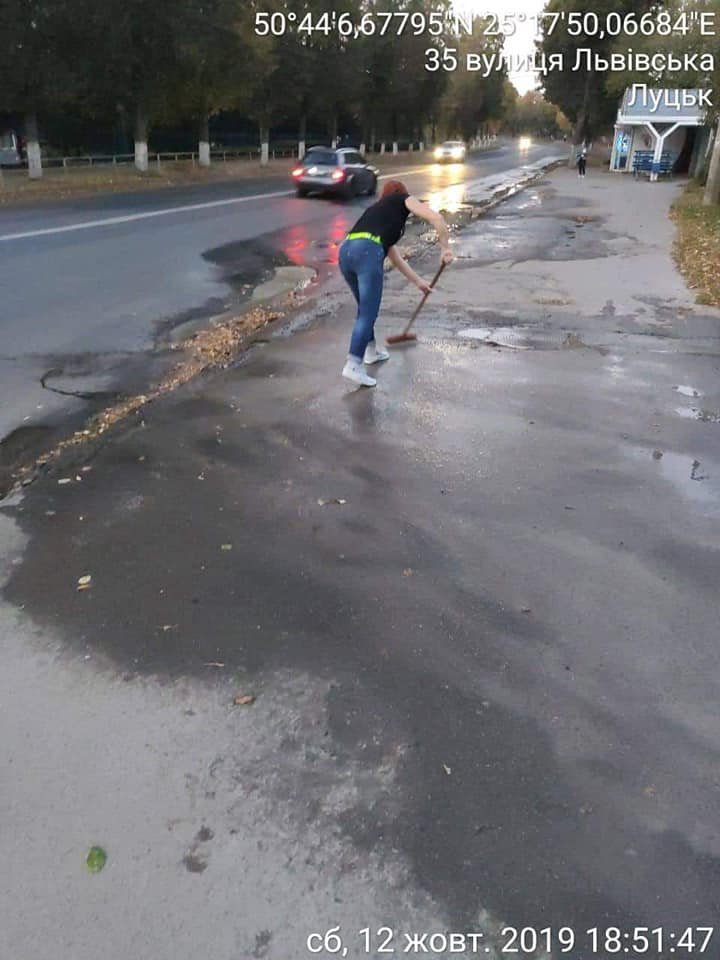 У Луцьку на вулиці Львівській зловили порушницю, яка забруднювала тротуар та дорогу нечистоти.