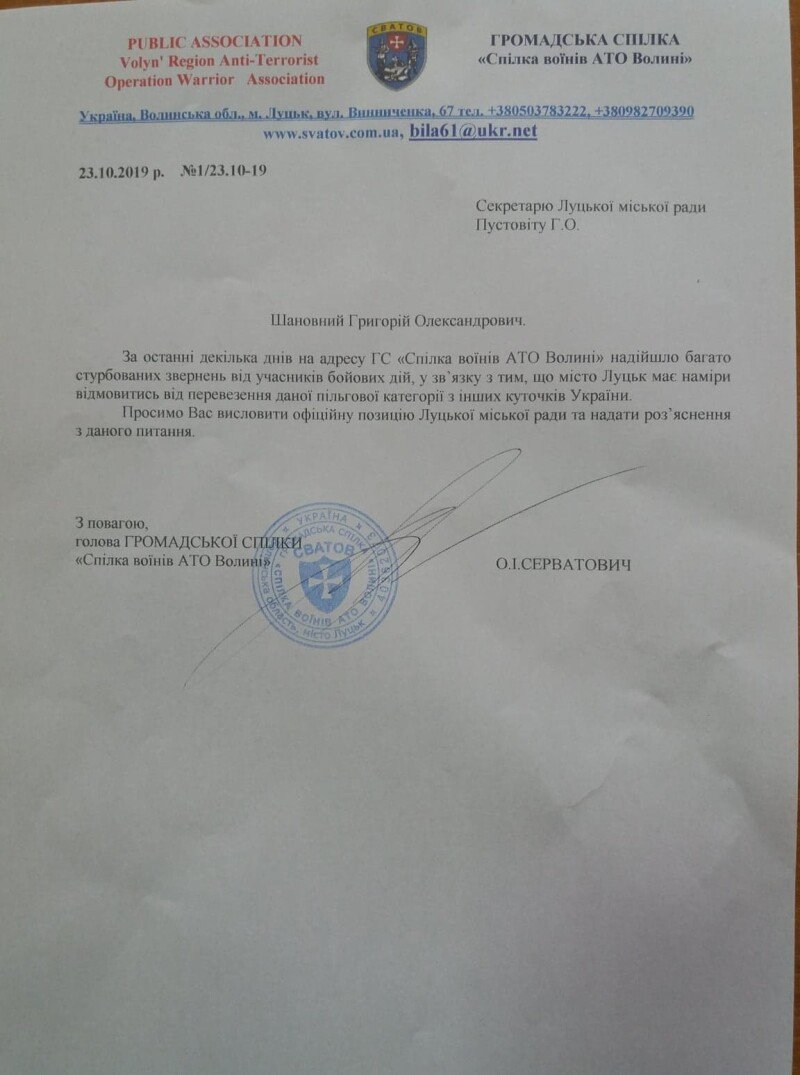 У зв'язку з цим, до Луцької міської ради звернулася громадська спілка «Спілка воїнів АТО Волині» щодо роз'яснення питання пільгового перевезення учасників бойових дій, які не є лучанами, пишуть на сайті міськради.