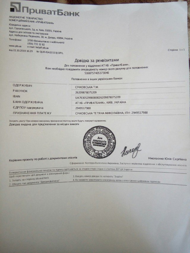 Реквізити для переказу коштів: картка Приватбанку 5168757405373046 Січковська Тетяна Миколаївна (мама Артема).