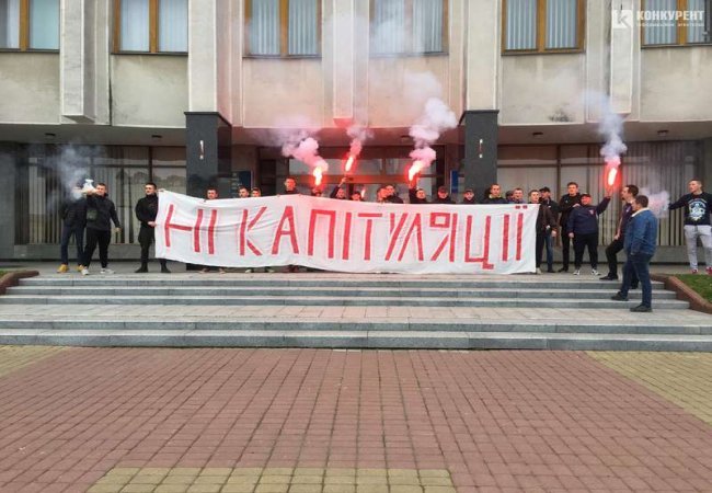 Під стіни Волинської ОДА активісти вийшли з фаєрами і плакатом «Ні капітуляції»