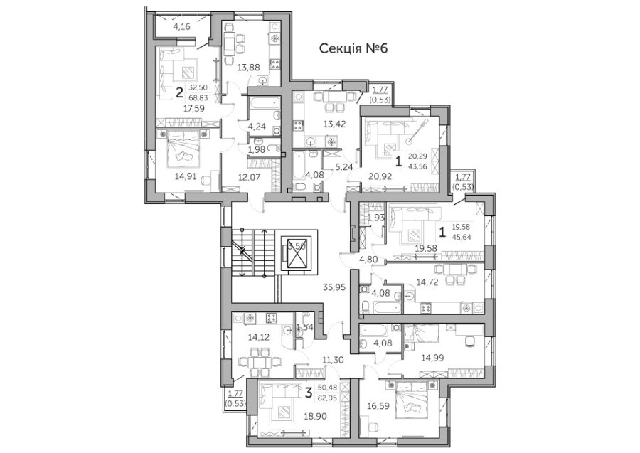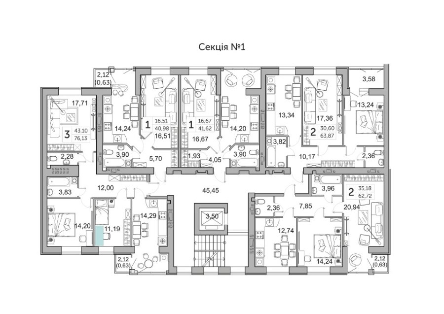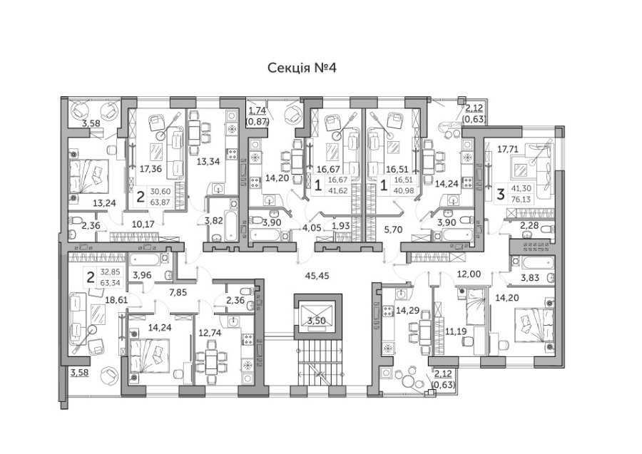 трикімнатні: 76,13 м2; 76,13 м2; 82,05 м2