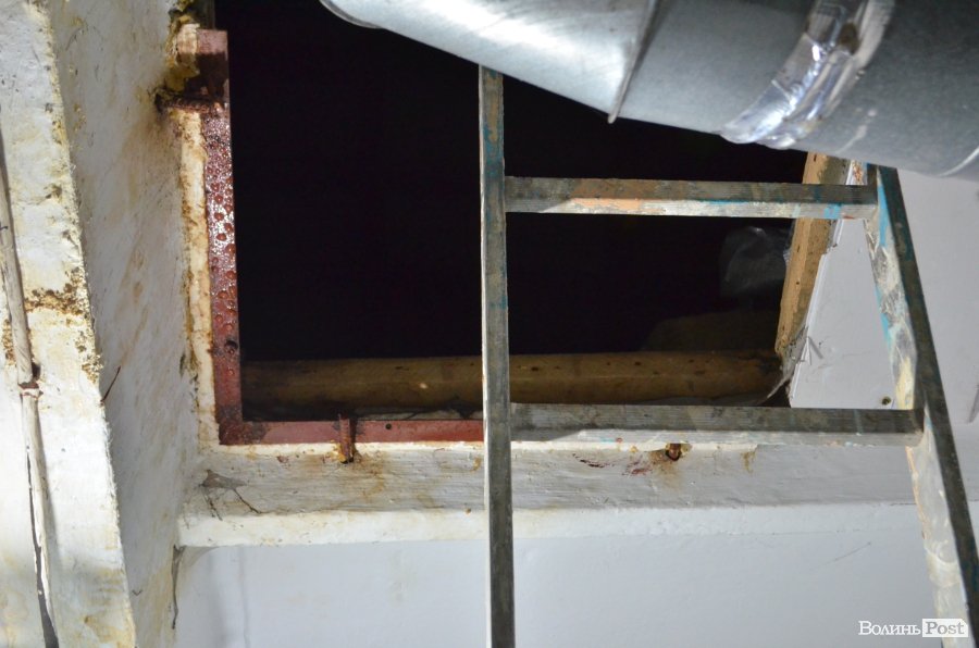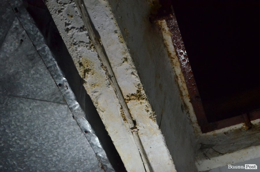 Показує вихід на дах. «Тут купа грибку. Дах затікає, а скоро зима. Є проблема, що немає достатнього нахилу, тож коли дощить, то мінвата, яка за стандартами повинна бути, просто почне розриватися. Питання потрібно терміново вирішувати, бо зараз все стікає там де конденсат і прямо на голову», – говорить директор басейну.