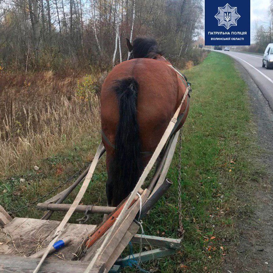 Відтак, неподалік Ковеля поліцейські патрулювали свою ділянку дороги та перевіряли швидкісний режим водіїв. До них звернулись громадяни й повідомили, що за півтора кілометра рухається гужовий транспорт без погонича. Кінь біжить посеред проїжджої частини та наражає на небезпеку себе й інших учасників дорожнього руху.