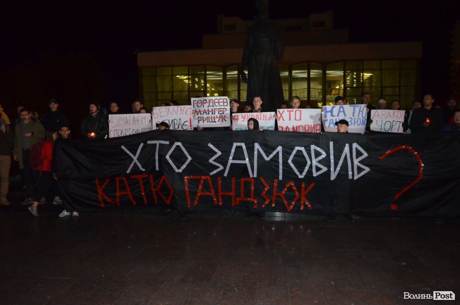 Луцькі ативісти прийшли на головну площу міста з тематичними плакатами, лампадками і свічками, аби запитати: «Хто замовив Катю Гандзюк?», адже виконавці сидять, а усім відомі замовники і досі на волі.