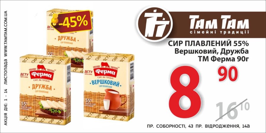 - Сир плавлений 55% "Вершковий", "Дружба" ТМ Ферма 90г - 8,90 грн;