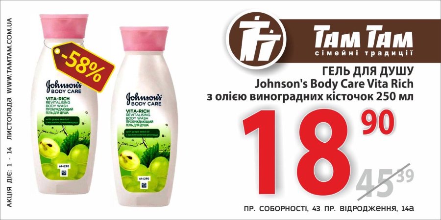 - Гель для душу "Johnson`s Body Care Vita Rich" з олією виноградних кісточок 250 мл - 18,90 грн;