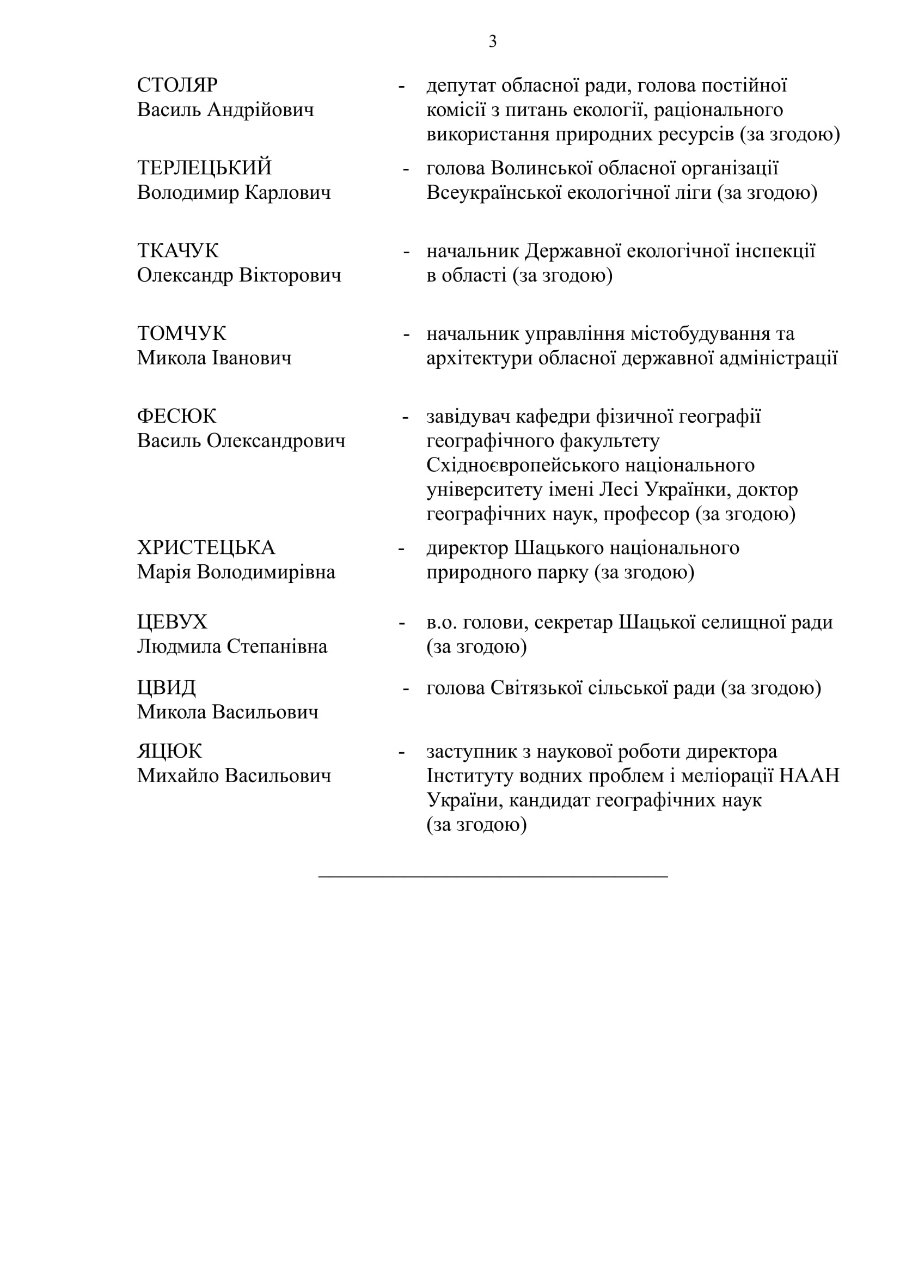 До складу робочої групи увійшли понад 20 представників влади та компетентних органів. Серед них - завідувач кафедри фізичної географії географічного факультету Східноєвропейського національного університету імені Лесі Українки Василь Фесюк, начальник управління містобудування та архітектури обласної державної адміністрації Микола Томчук, професор кафедри екології та агрономії факультету екології, туризму та електроінженерії Луцького національного технічного університету Ярослав Мольчак, в.о. наукового співробітника відділу методів і систем дистанційного зондування Фізико-механічного інституту ім. Г.В. Карпенка НАН України, кандидат технічних наук Ольга Альохіна.