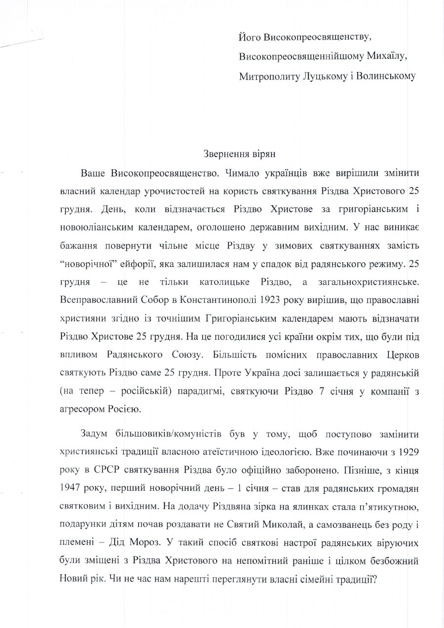 Віряни луцьких релігійних громад звертаються до митрополита Луцького і Волинського Михаїла з проханням почати робити кроки для того, аби відійти від радянської традиції – святкувати Різдво 7 січня.