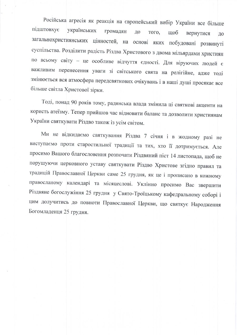 «Ми не відкидаємо святкування Різдва 7 січня і в жодному разі не виступаємо проти старостильної традиції та тих, хто її дотримується. Але просимо Вашого благословення розпочати різдвяний піст 14 листопада, щоб, не порушуючи церковного уставу, святкувати Різдво Христове згідно з правилами та традиціями Православної Церкви саме 25 грудня, як це і прописано в кожному православному календарі та місяцеслові», – йдеться у листі.