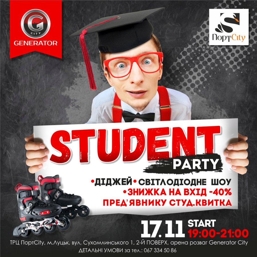 Арена розваг «GeneratorCity» запрошує всіх жителів та гостей міста на унікальну вечірку "STUDENT PARTY" на роликах, яка відбудеться 17 листопада о 19 годині.