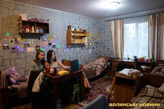 На одному з поверхів заглядаємо в кімнату до дівчат, одну з яких із віником під пахвою упіймали ще на першому поверсі. Вони саме обідають і дивляться на ноутбуці фільм іноземною мовою. У кімнаті по-дівчачому затишно, на стіні блимає гірлянда, на підлозі – килимок, ліжка акуратно застелені, полички заставлені книжками й милими дрібничками.