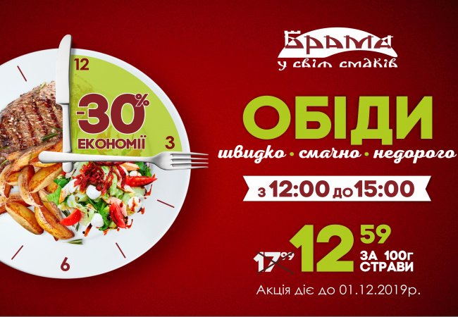 Так, з 12:00 до 15:00 діє знижка - 30% на страви з лінії швидкого харчування. До слова, акція діє до 1 грудня 2019 року і не поширюється на алкогольні напої.