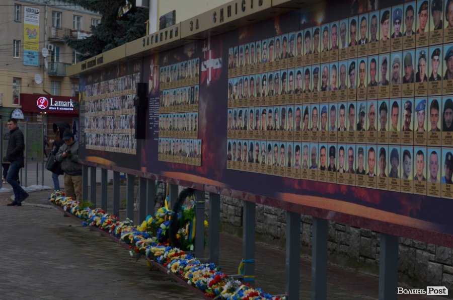 Схиляли голови і приносили квіти до пам’ятного фотостенду «Герої Небесної Сотні - Загинули за Єдність України» на Театральному майдані міста Луцька у четвер, 21 листопада.