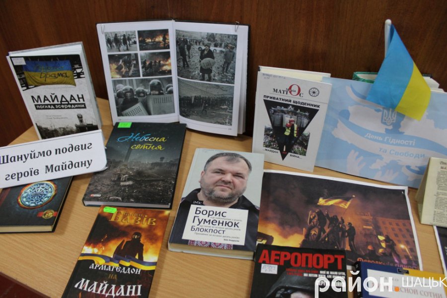 Пригадати пам'ятні події, опинитися в атмосфері Майдану, відчути, як у ті дні підтримував Україну світ, допомогли кадри з фільмів про Революцію гідності та книжкова виставка від Шацької центральної районної бібліотеки – «Шануймо подвиг героїв Майдану».
