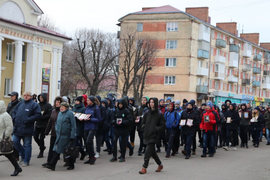 Молодь вирушила на площу, тримаючи в руках портрети Героїв Майдану. На кілька хвилин колона зупинилася – представники влади поклали квіти до дошки пам’яті загиблим в АТО (ООС), - пише Район.Володимир-Волинський