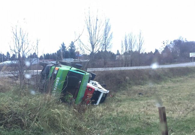 Автомобіль-евакуатора та машина Bobcat, що була прилаштована вгорі на першій, з’їхали у кювет і перевернулися на бік. Обидва авто зазнали незначних механічних пошкоджень.