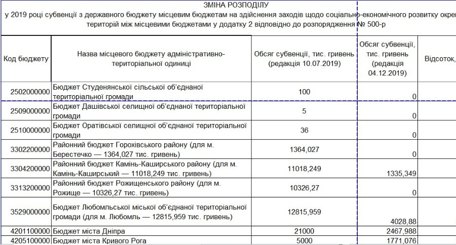 Як йдеться на сайті АМУ, 4 грудня на засіданні уряду внесли зміни до розпорядження Кабінету Міністрів від 10 липня 2019 року № 500-р, якими змінили розподіл субвенції між місцевими бюджетами на соціально-економічний розвиток та зменшили на 1,7 млрд гривень її загальний обсяг. Тобто, громадам розподілили 790 мільйонів із запланованих 2,5 млрд гривень.