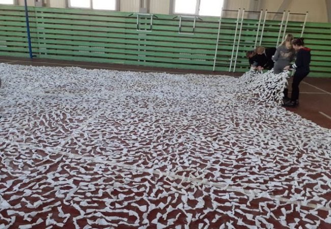Школярі та вчителі волинської школи сплели величезну маскувальну сітку для воїнів
