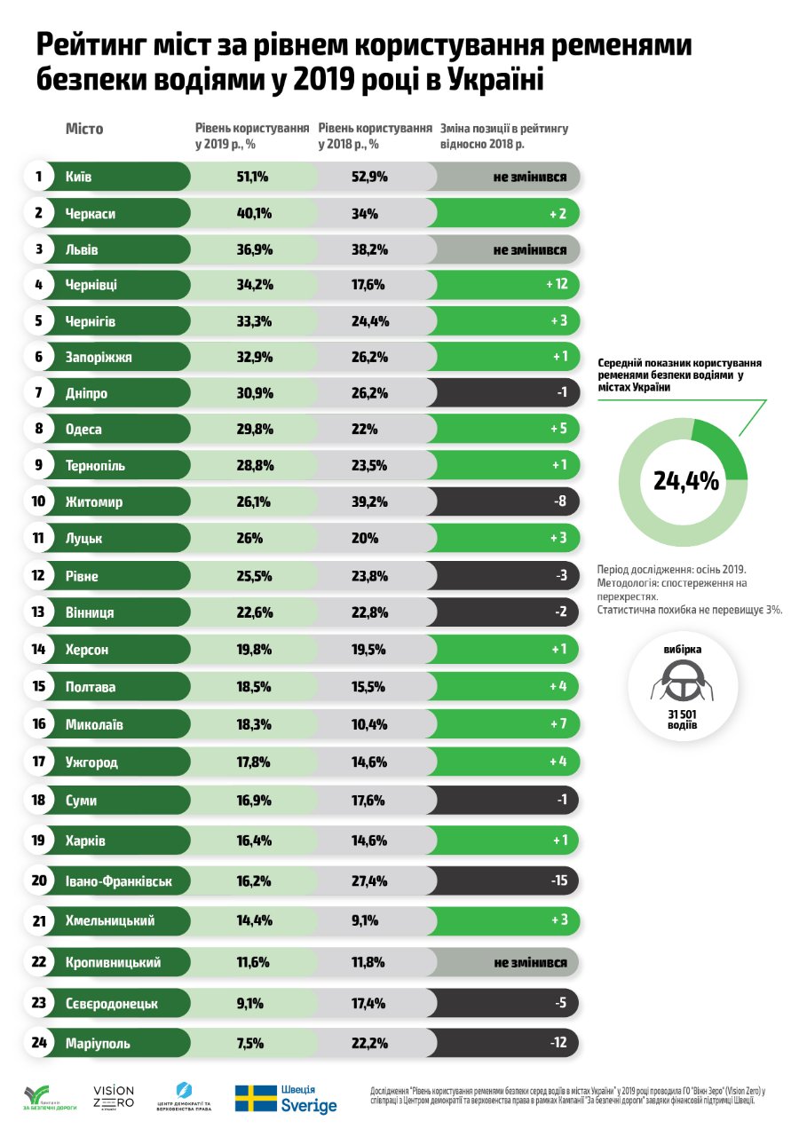 За даними дослідження, лідером рейтингу став Київ – у столиці ременями безпеки користуються 51% водіїв. До топ-5 також увійшли Черкаси (40%), Львів (37%), Чернівці (34%) та Чернігів (33%).