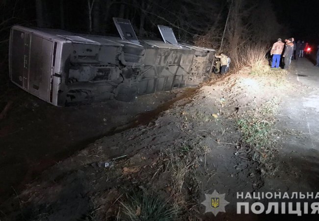 Дорожньо-транспортна пригода за участю міжнародного автобуса сталася 12 грудня близько 18:50 поблизу міста Новограда-Волинського, що на Житомирщині. У результаті ДТП травми отримали четверо людей.