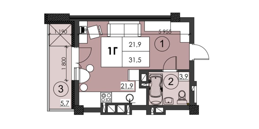 1. Продуманість кожного квадратного метра – вбудовані меблі та побутова техніка (варильна поверхня, витяжка, пральна машина, стільці, ліжко та інше).