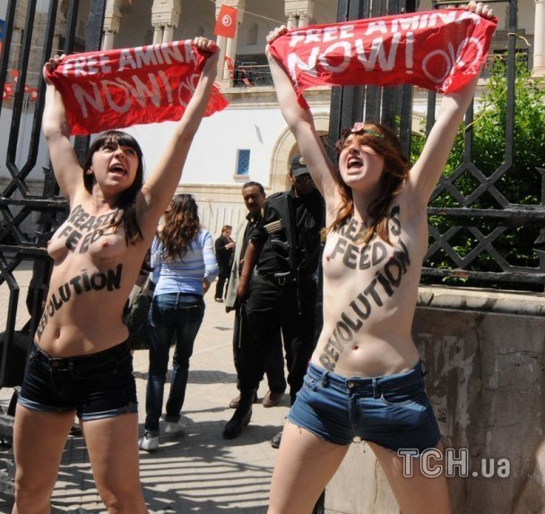 Дві француженки і німкеня зібралися біля міністерства юстиції Тунісу та оголили груди на підтримку своєї соратниці Аміни, яку було затримано 19 травня, - пише ТСН.