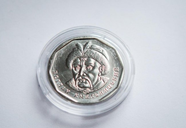 Монета номіналом 5 гривень виготовлена з цинкового сплаву з гальванічним покриттям. На реверсі монети зображено портрет гетьмана Богдана Хмельницького, як і на банкноті аналогічного номіналу.