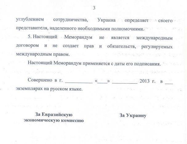 При цьому в документі зазначено, що меморандум, який президент Віктор Янукович збирається підписати в Мінську, не є міжнародним договором і не створює прав і зобов'язань, регульованих міжнародним правом.
