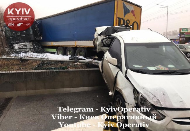 У Києві вранці в понеділок, 23 грудня, фура зім'яла два легковики і влетіла в заправку, зносячи все на своєму шляху.