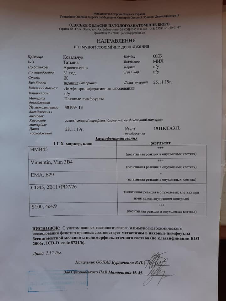 «Спершу думали, що то запалення лімфовузлів. Але лікуванню це не піддавалося. Тоді нам сказали зробити біопсію, медики запідозрили рак. На жаль, меланома підтвердилася. Метастази уже пішли в лімфовузли», – розповідає Тетяна.