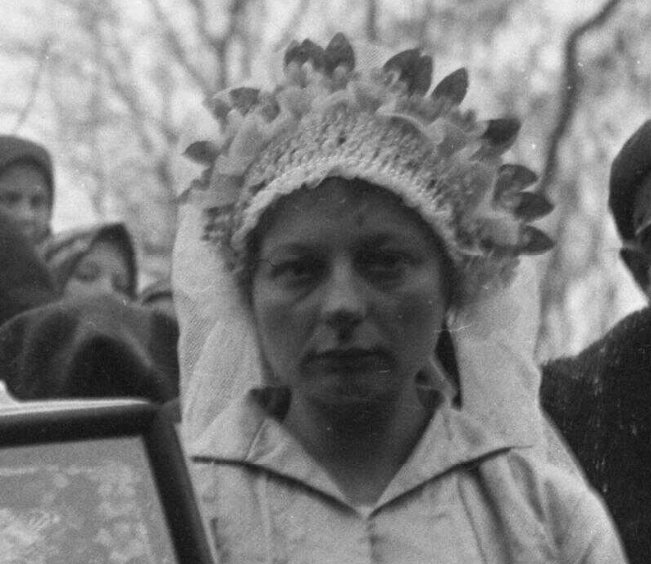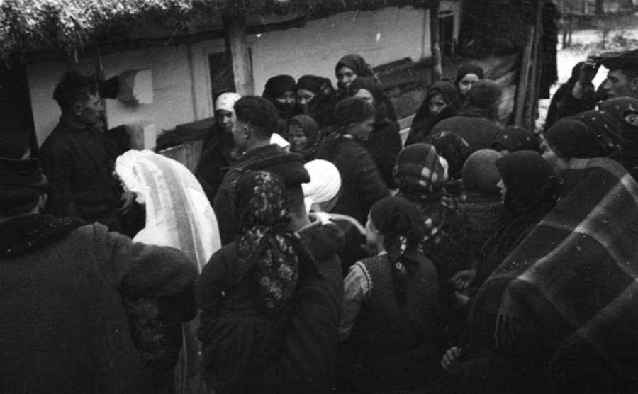 Перше фото є гарним джерелом для того, щоб побачити, як виглядали молодий та молода на Волині 80 років тому. Як бачимо, у молодят в руках ікони з рушниками, і навіть можна побачити традиційну вишивку. Видно, що весілля відбувається в холодну пору року, адже поверх святкового одягу є верхній.