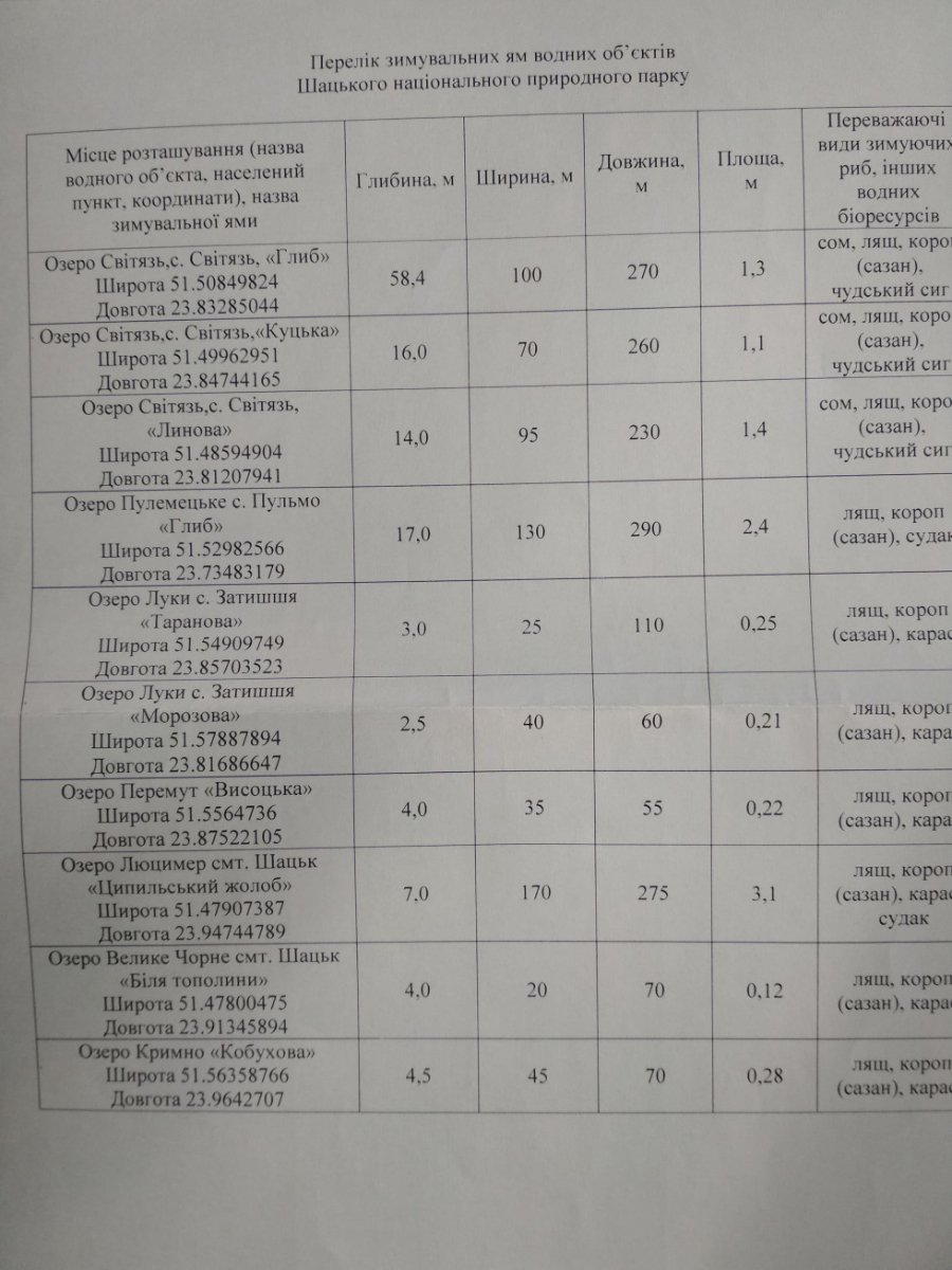 Щодо водойм Шацького району, де на зимувальних ямах заборонено вилов риби, то йдеться про озера Світязь, Пулемецьке, Луки, Перемут, Люцимер, Велике Чорне, Кримно.