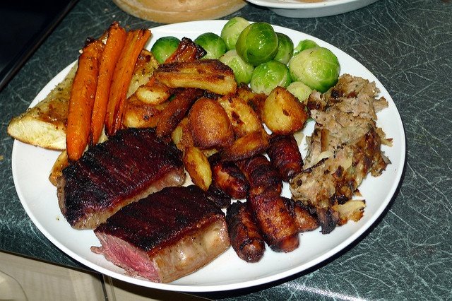 У Великій Британії традиційно їдять індичку (але іноді це може бути гусак або курка) з соусом із журавлини, брюссельською капустою, pigs in blankets (невеликі ковбаски, загорнуті беконом), смажені моркву, картоплю і пастернак.