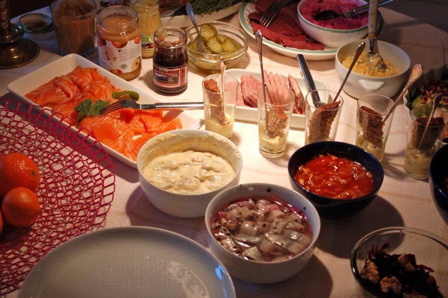 На традиційному різдвяному столі у Швеції ви знайдете шинку, фрикадельки, ковбаски, різні види оселедця, копчений лосось або вугор, червону капусту, брюссельську капусту і «Спокусу Янссона» (картопляна запіканка з анчоусами).