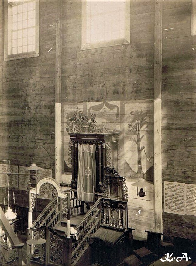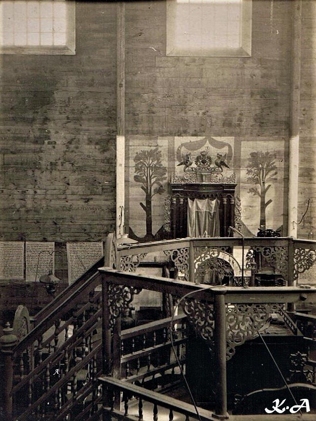На 100-літніх зображеннях видно, що синагога була дерев'яна, але дуже велика. Там показано, що будівля була прикрашена також дерев'яними речами, оформленими візерунками рослинної тематики.