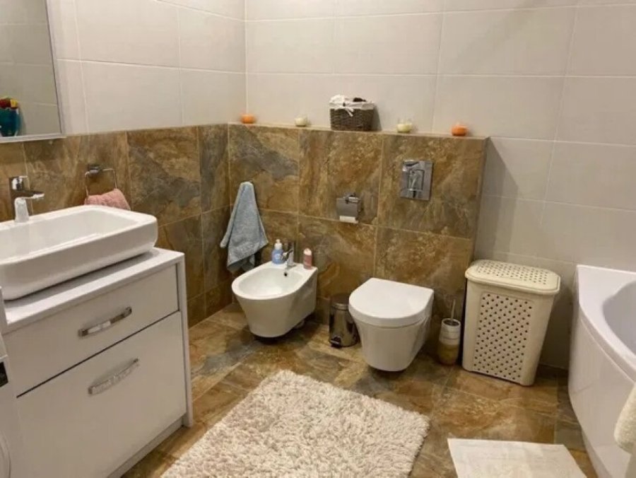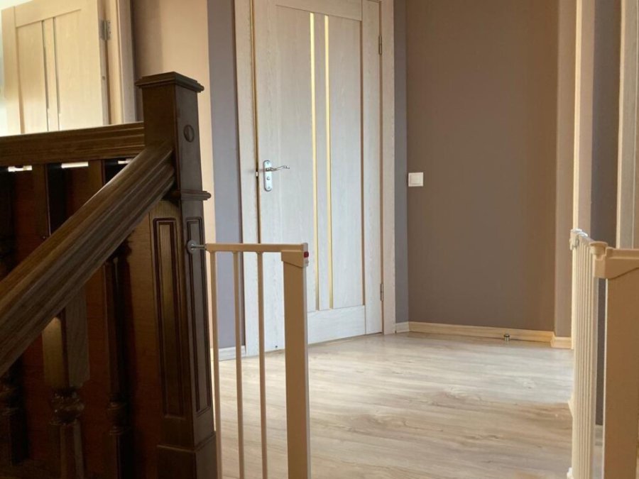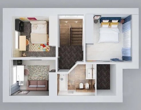 Таунхаус – двоповерховий. На першому поверсі – холл, вітальня, кухня і санвузол. На другому – три спальні, санвузол та гардеробна.