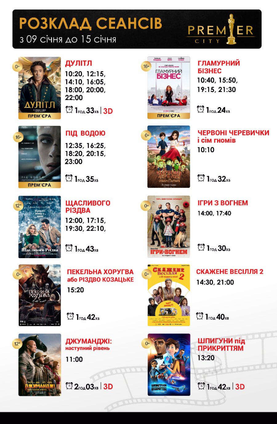Пропонуємо розклад сеансів з 9 до 15 січня в кінотеатрі «PremierCity», що у ТРЦ «ПортCity».
